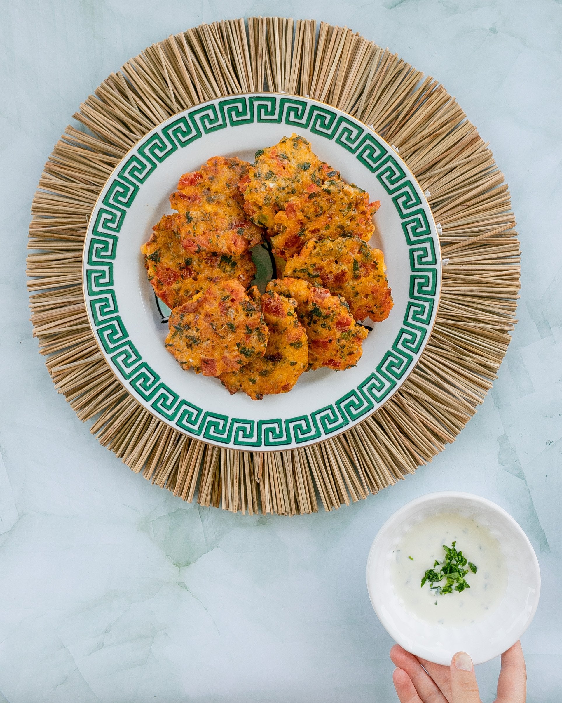 In a large mixing bowl, add tomatoes, scallions, onions, herbs, mint, egg, cheese (optional), and gluten-free flour. Mix well and set aside for a couple minutes.